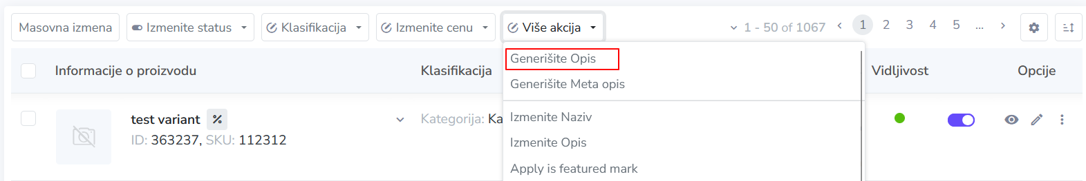 - Izaberite proizvod/proizvode iz liste za koje želite da generišete opis;