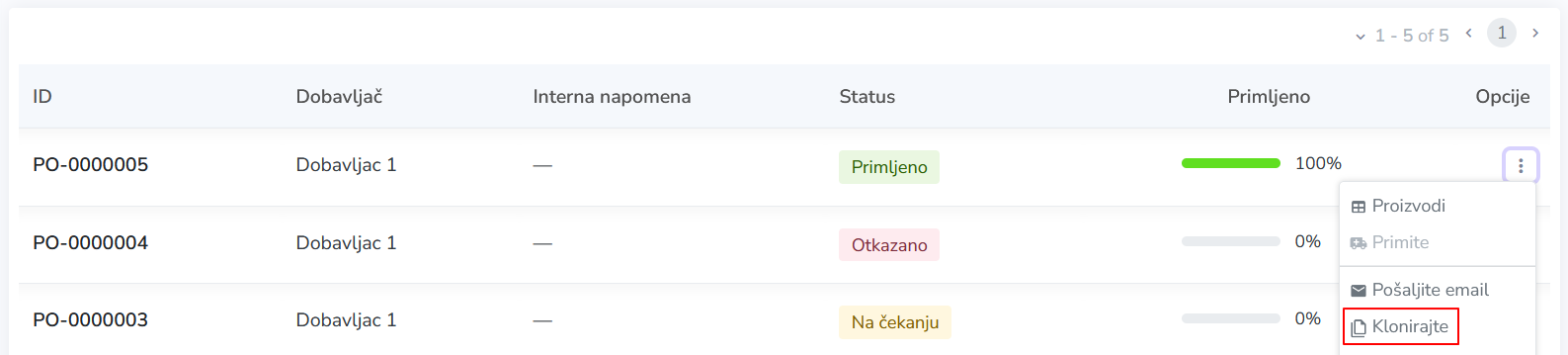 Da biste izvršili novi prijem za niz prethodno naručenih proizvoda, na stranici Porudžbine nabavke imate funkciju Klonirajte, kojoj možete pristupiti iz menija opcija povezanih sa postojećim prijemom.