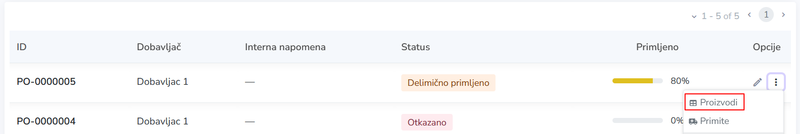 - Sa stranice Porudžbine dobavljača pristupite meniju opcija povezanih sa prijemom robe koji ste dodali;