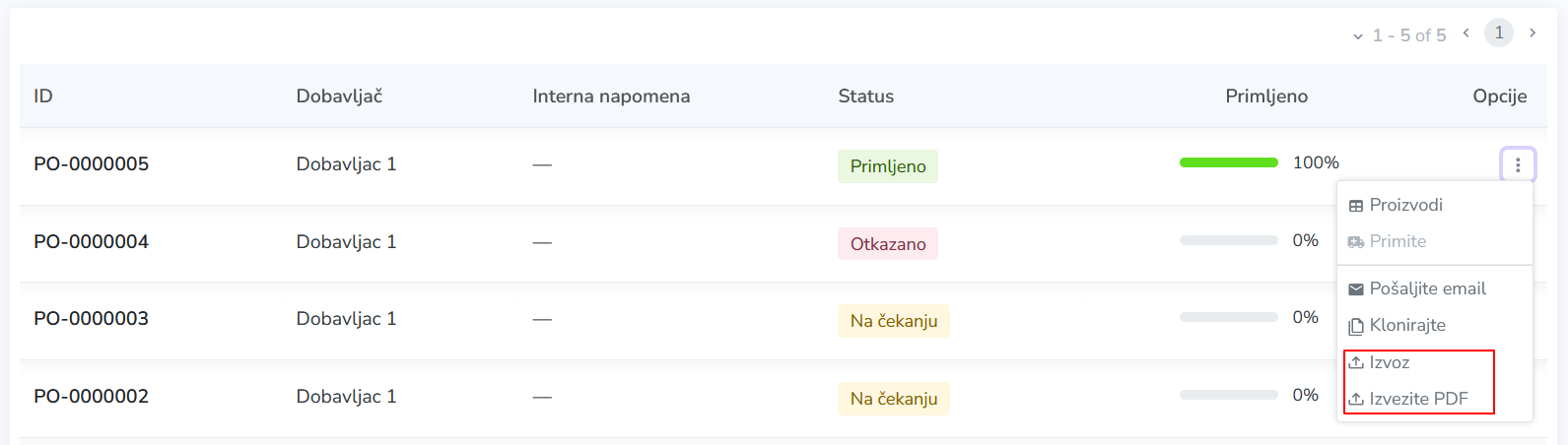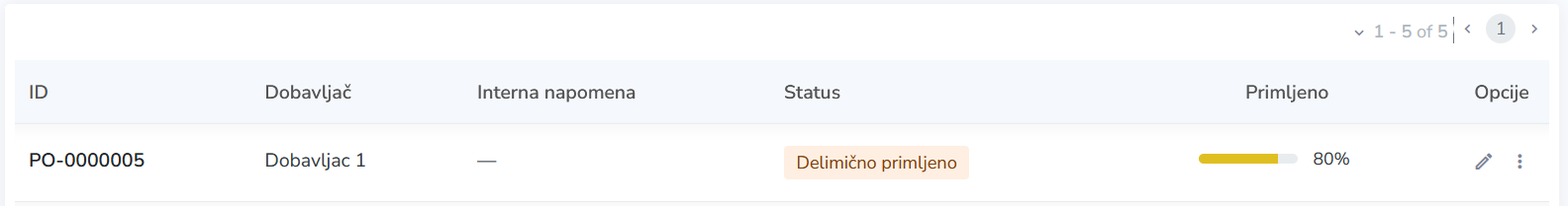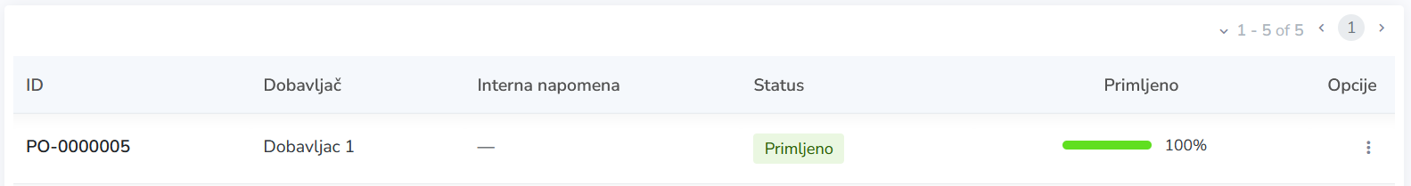 Nakon prijema svih proizvoda iz porudžbine, status će biti promenjen u Primljeno, a napredak u koloni Primljeno biće ažuriran na 100%.