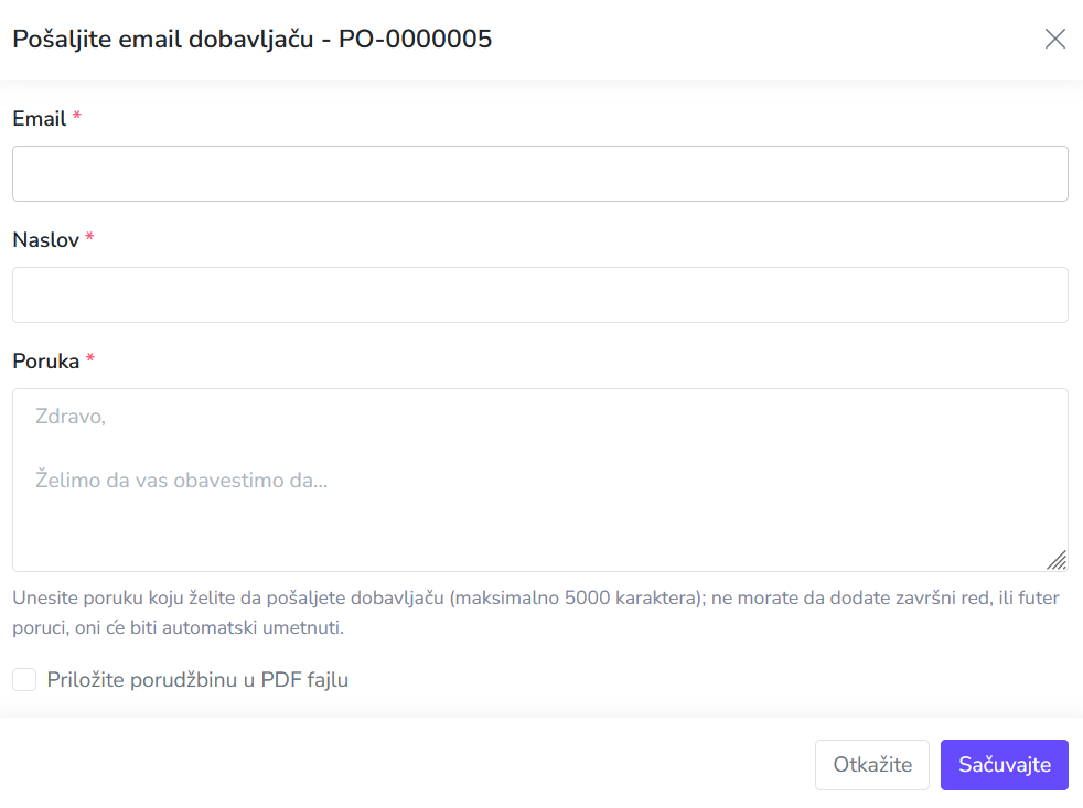 U overlayer-u, unesite email adresu dobavljača, zatim dodajte predmet e-poruke i poruku. Opciono čekirajte Priložite porudžbinu u PDF fajlu ako želite da priložite prijem proizvoda uz email poruku;